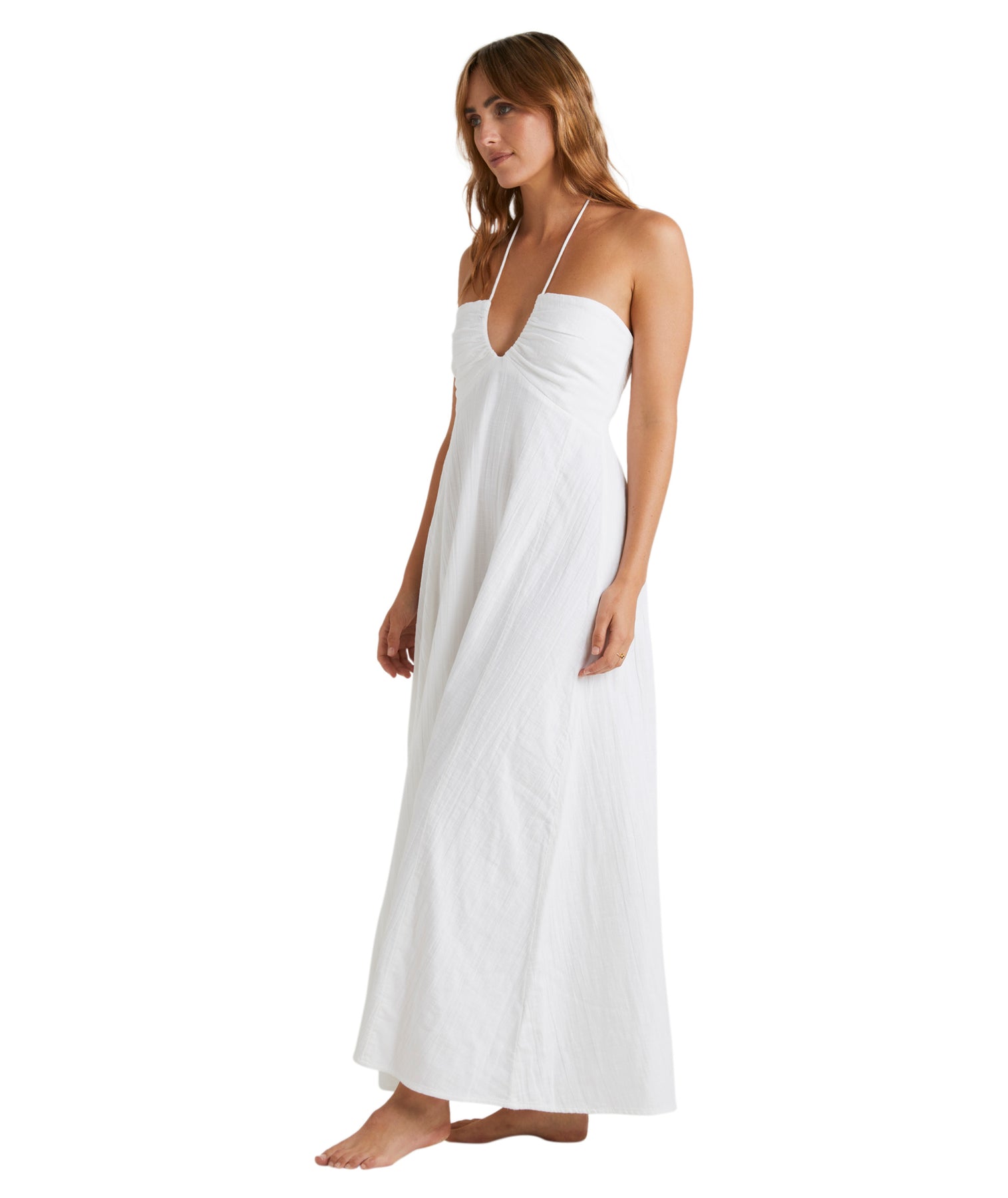 UBJWD00343-SCS Product Type: Halter maxi dress Fabric: Crinkle viscose Fit: Fitted bodice, easy skirt Neck: Straight neck with front keyhole Branding: Metal plate Gathers at front bust with open keyhole detail, adjustable halter ties, smocked at back bodice [Main Fabric] 100% Cotton
