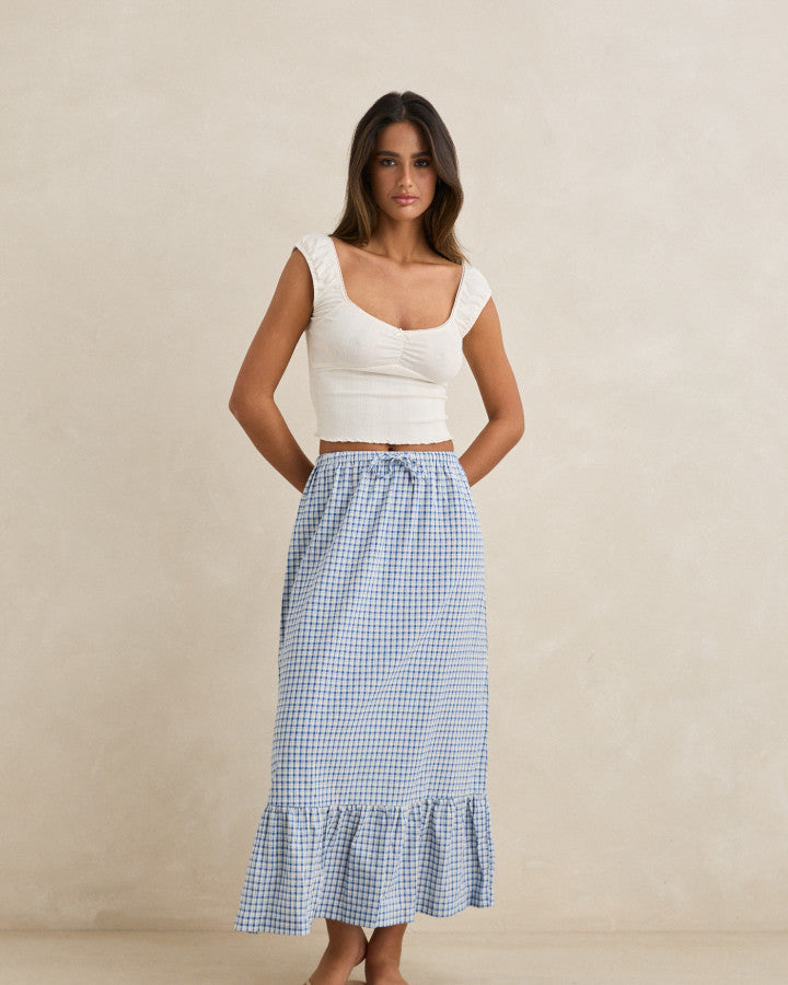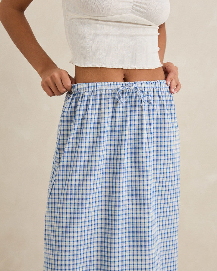 LOLA CHECK TIERED MAXI SKIRT - BLUE